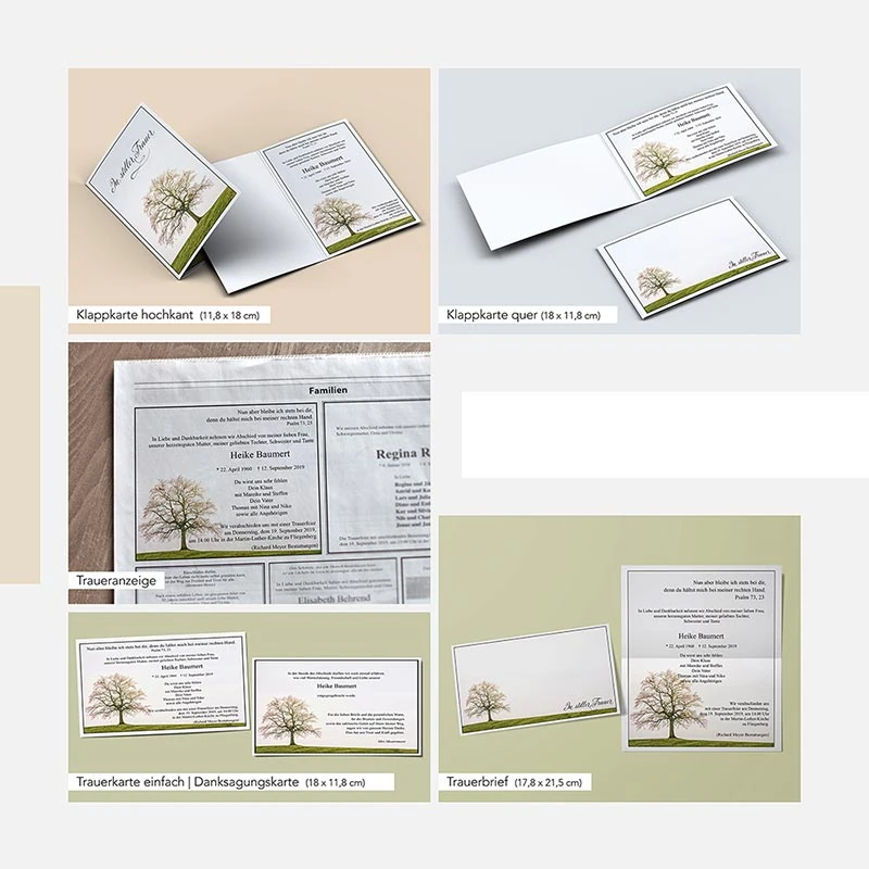 Verschiedene Trauerdruckformate: Klappkarte, einfache Karte, Trauerbrief und Traueranzeige.